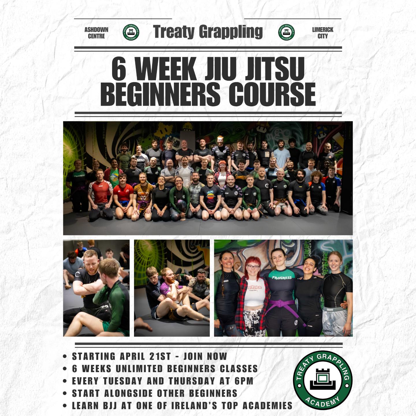 6 weeks unlimited sessions included, every Tuesday and Thursday at 6pm. Start alongside a group of other beginners, and learn the basics of Jiu Jitsu at one of Ireland's top academies.